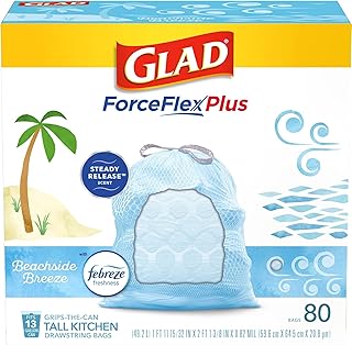 Glad ForceFlexPlus Müllbeutel mit Kordelzug, groß, ca. 45 Liter, Febreze Beachside Breeze – 80 Stück (Paket kann variieren)